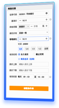 | 资金使用 | 预埋单扣除全额保证金或股票数量,挂撤低效易出错,无法灵活运用资金或支撑多种交易预案 | 条件单指令不扣除资金和股票,多点埋伏目标股票获取更多机会,多种交易方案可同步在线 |